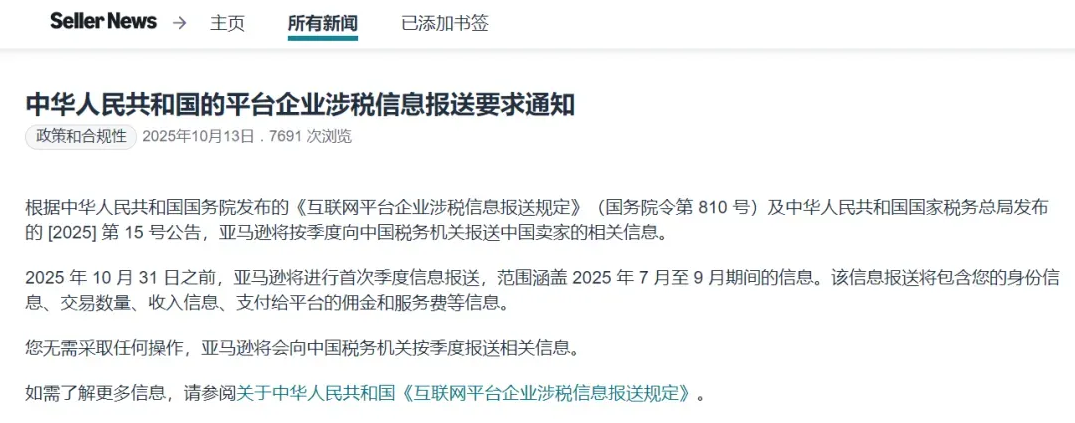 2025年10月13日,亚马逊官方发布公告,明确要求于10月31日前向中国税务机关报送平台上的中国卖家信息,包括销售数据、收入金额等。这一举措旨在配合中国跨境税务监管政策的实施,标志着对跨境电商税务合规性的要求进一步提高。